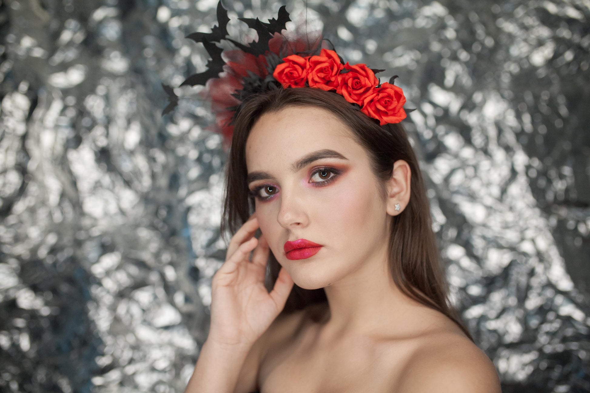 Step into a world of dark elegance and fantasy with this one-of-a-kind handmade gothic headband. Featuring dramatic red roses, eerie black bats, layered black-and-red tulle, and intricate black foliage — this headpiece is the perfect accessory for Halloween, cosplay, photoshoots, or gothic-themed events.