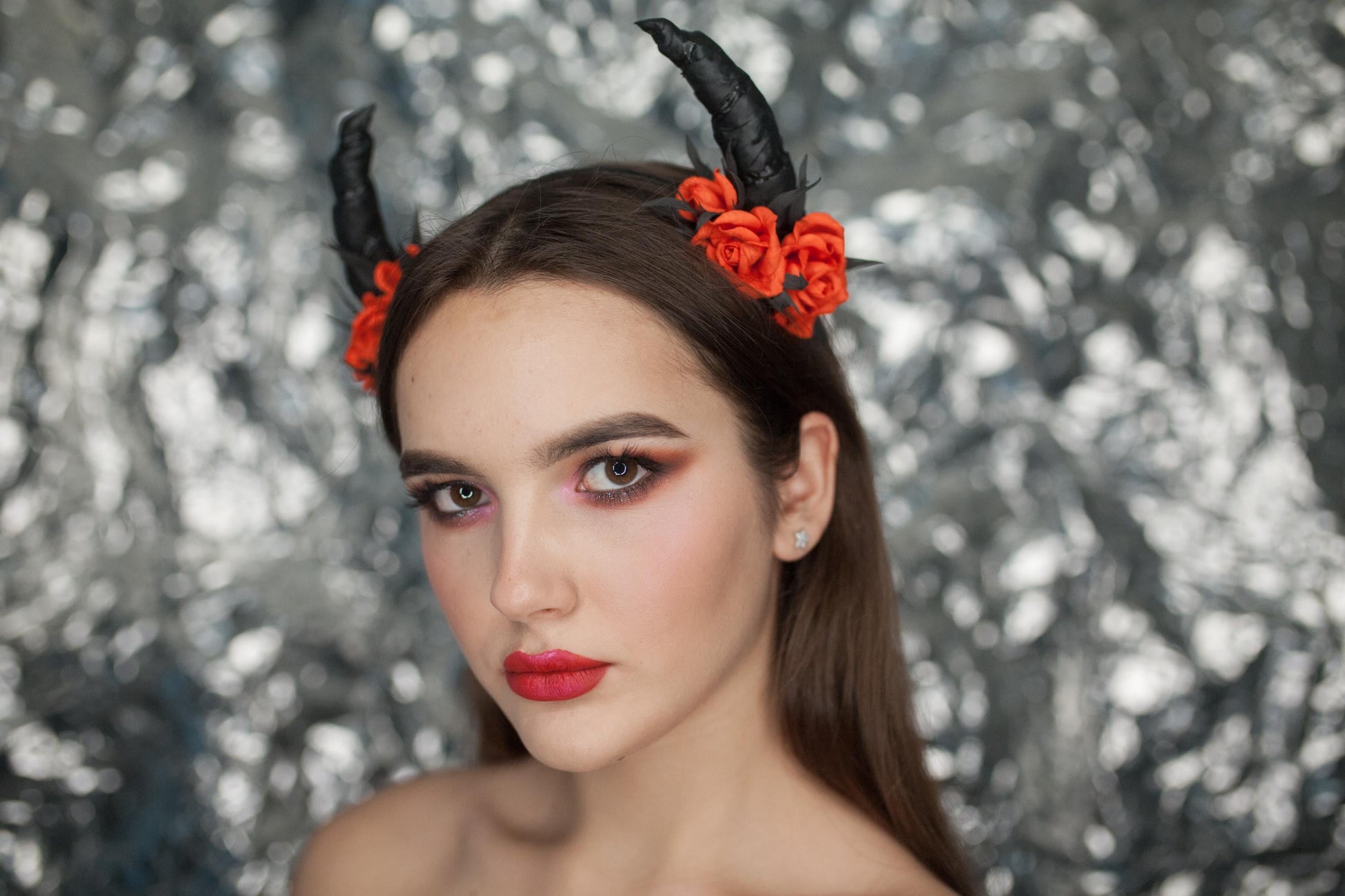 This devil horns headband, decorated with the queen of the flowers – impetuous red rose which represents fire and excitement! Roses are handmade and made out of foam Eva material looking realistic and not afraid of water. Demon horns headband is light and weight not more then 1,4oz. (40 gr.)