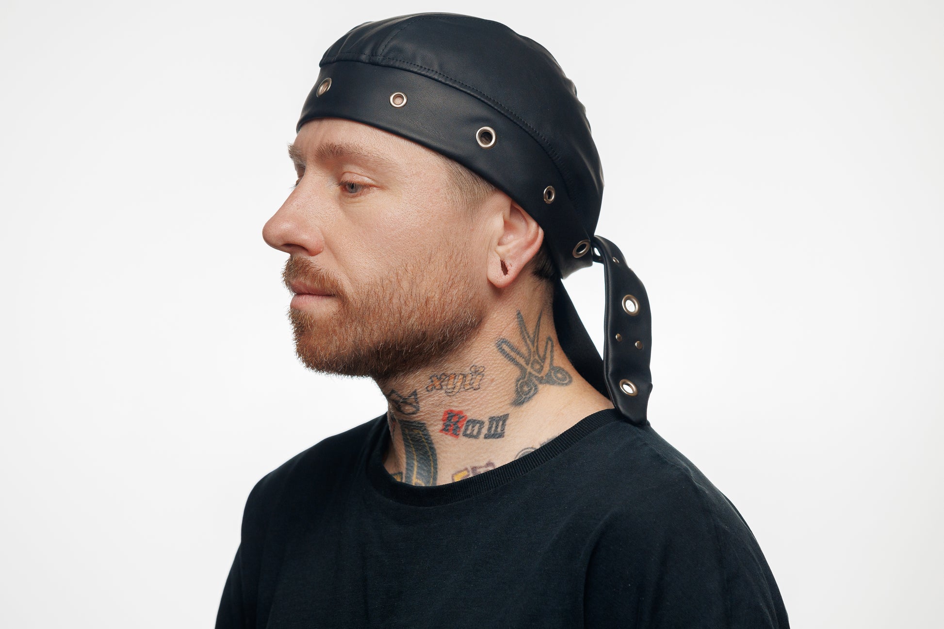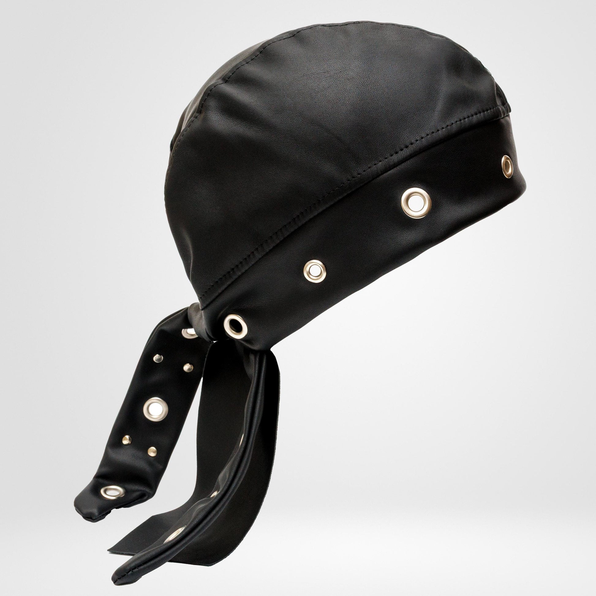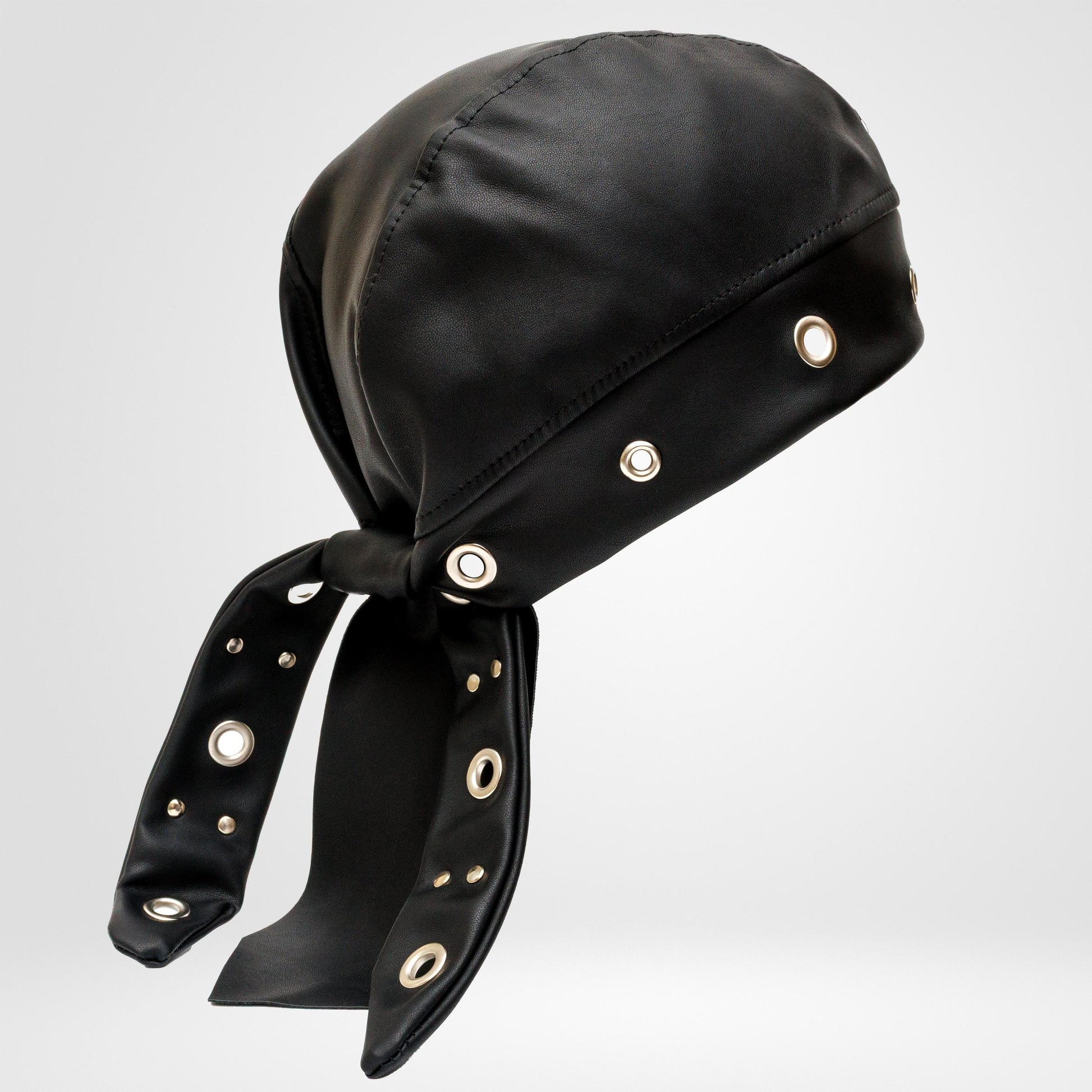 Black Vegan Leather Biker Beanie Bandana Headwrap | Unisex Skull Cap with Eyelets