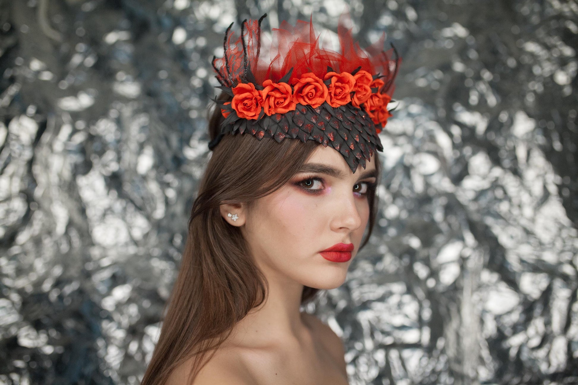 Dragon Scale Headband: Red Roses, Wings & Veil - Fantasy Costume