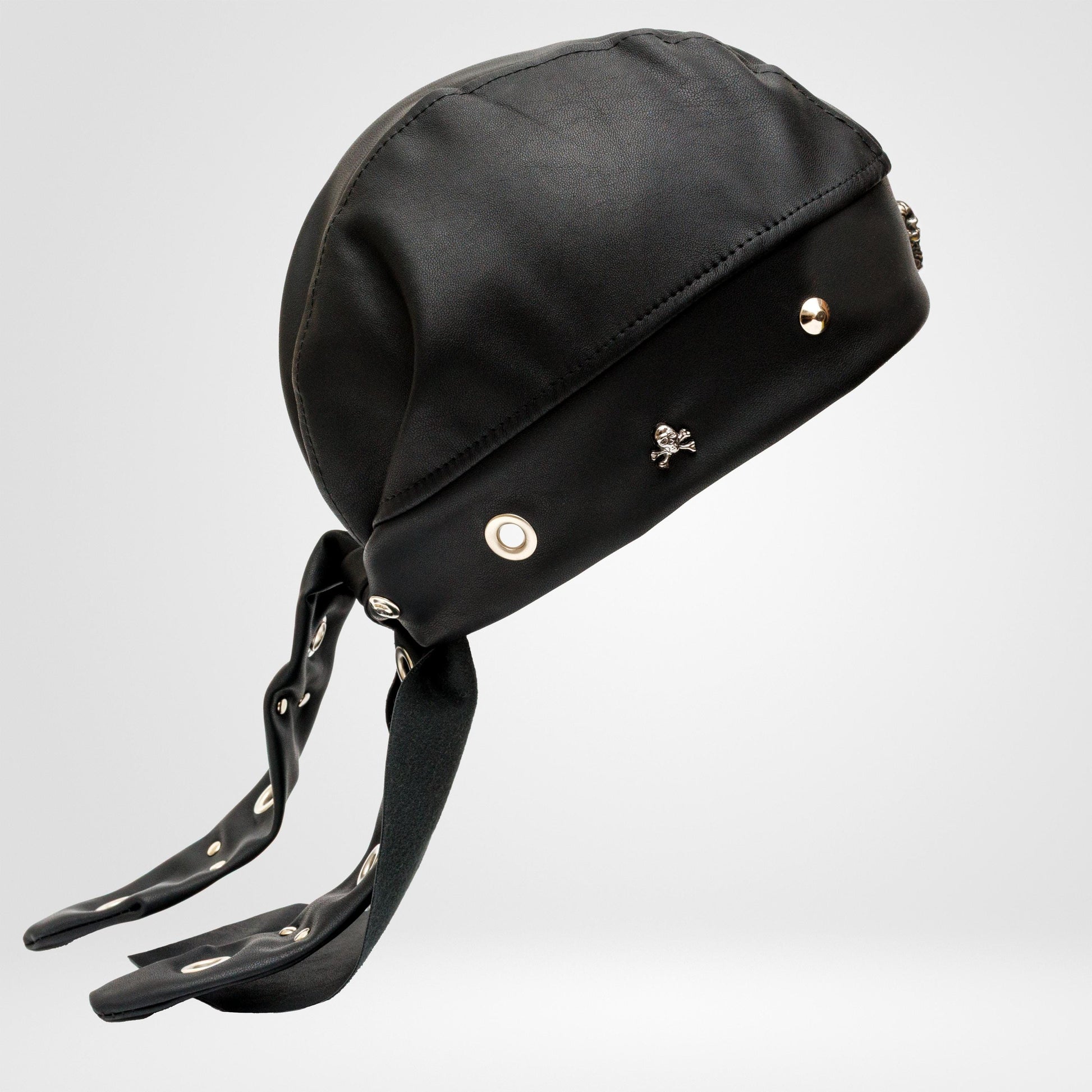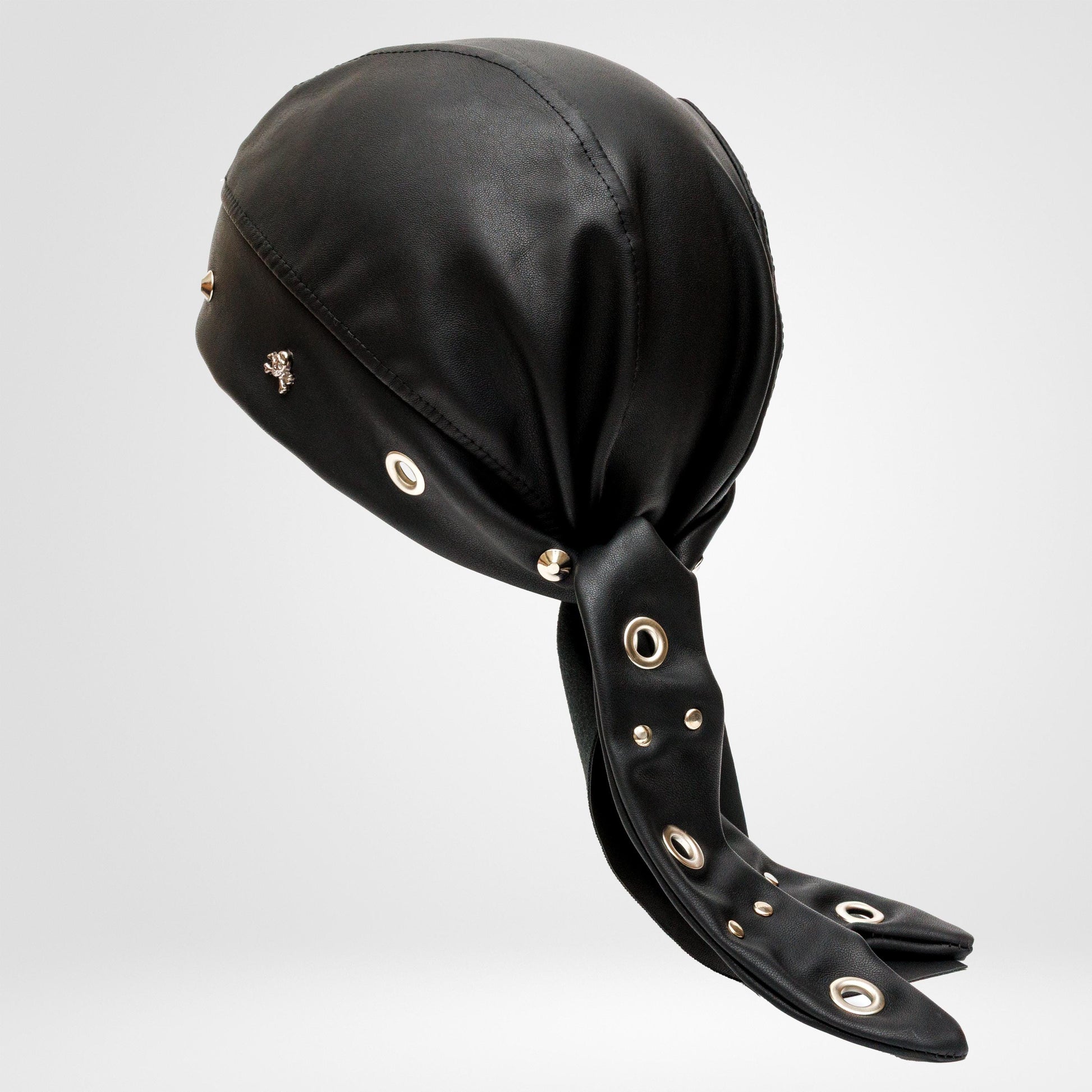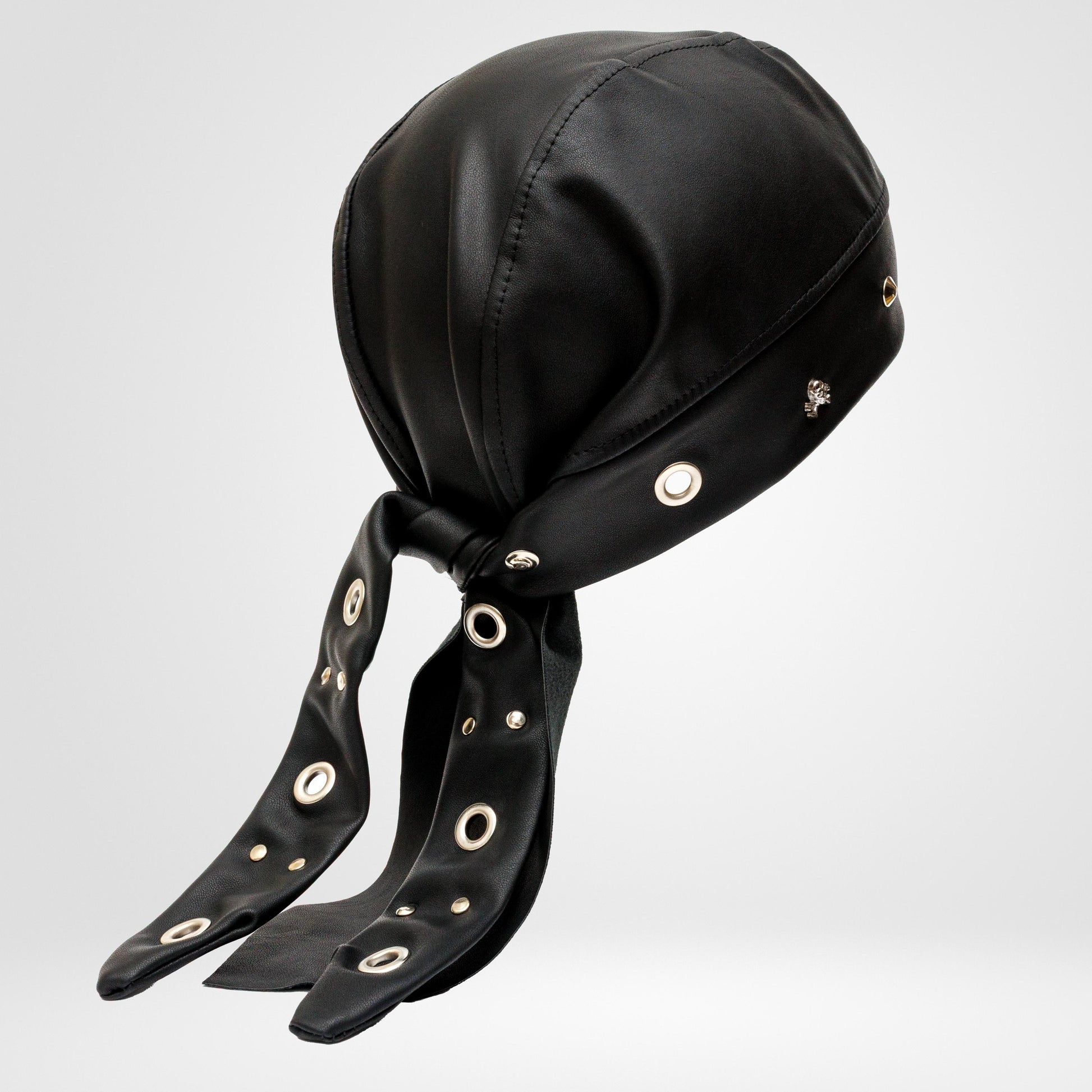 Handmade Black Faux Leather Beanie Biker Bandana – Skull Studded Headwrap