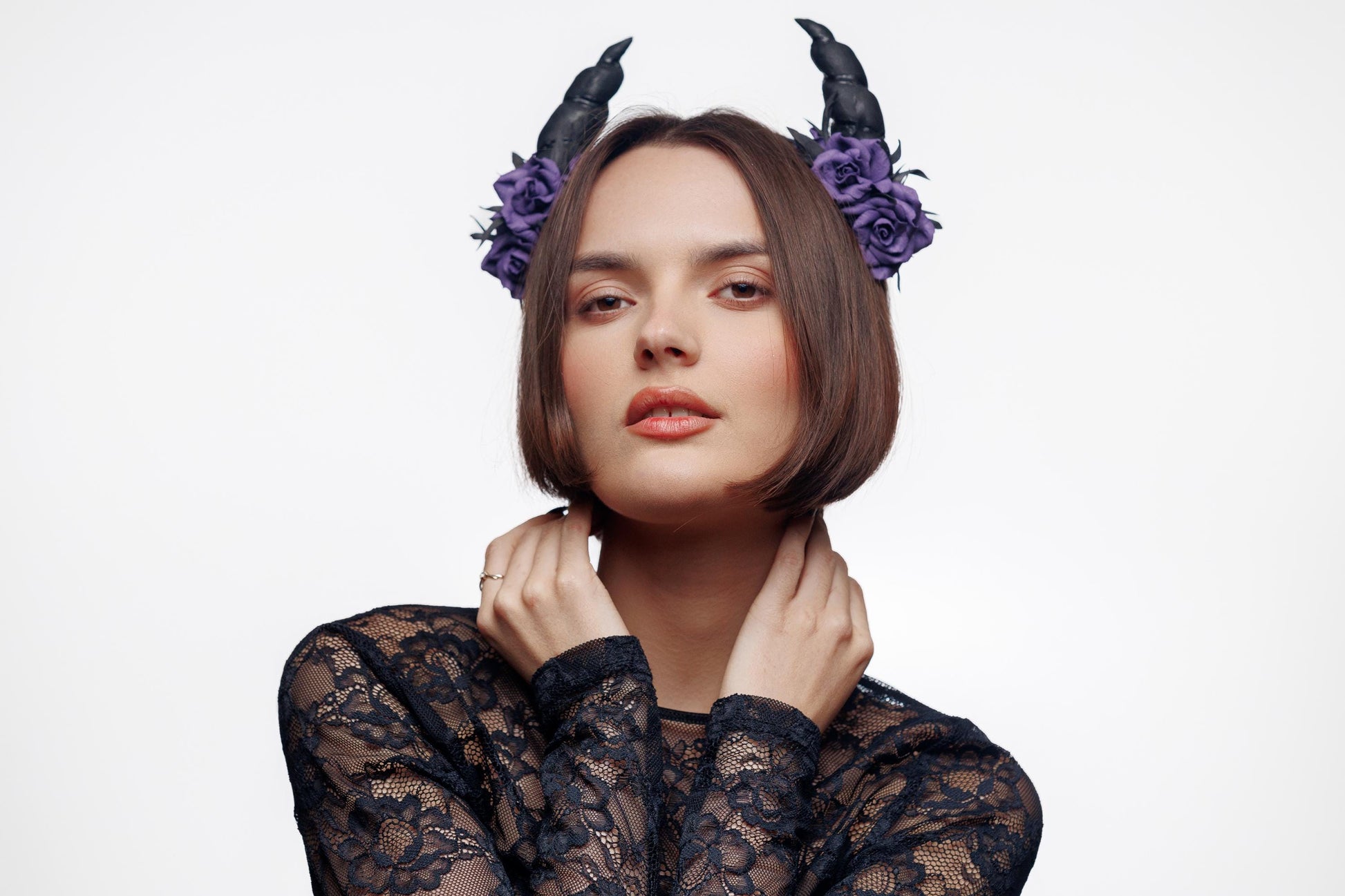Black demon horns headband, decorated with the queen of flowers-purple rose, meaning deep strength and power.