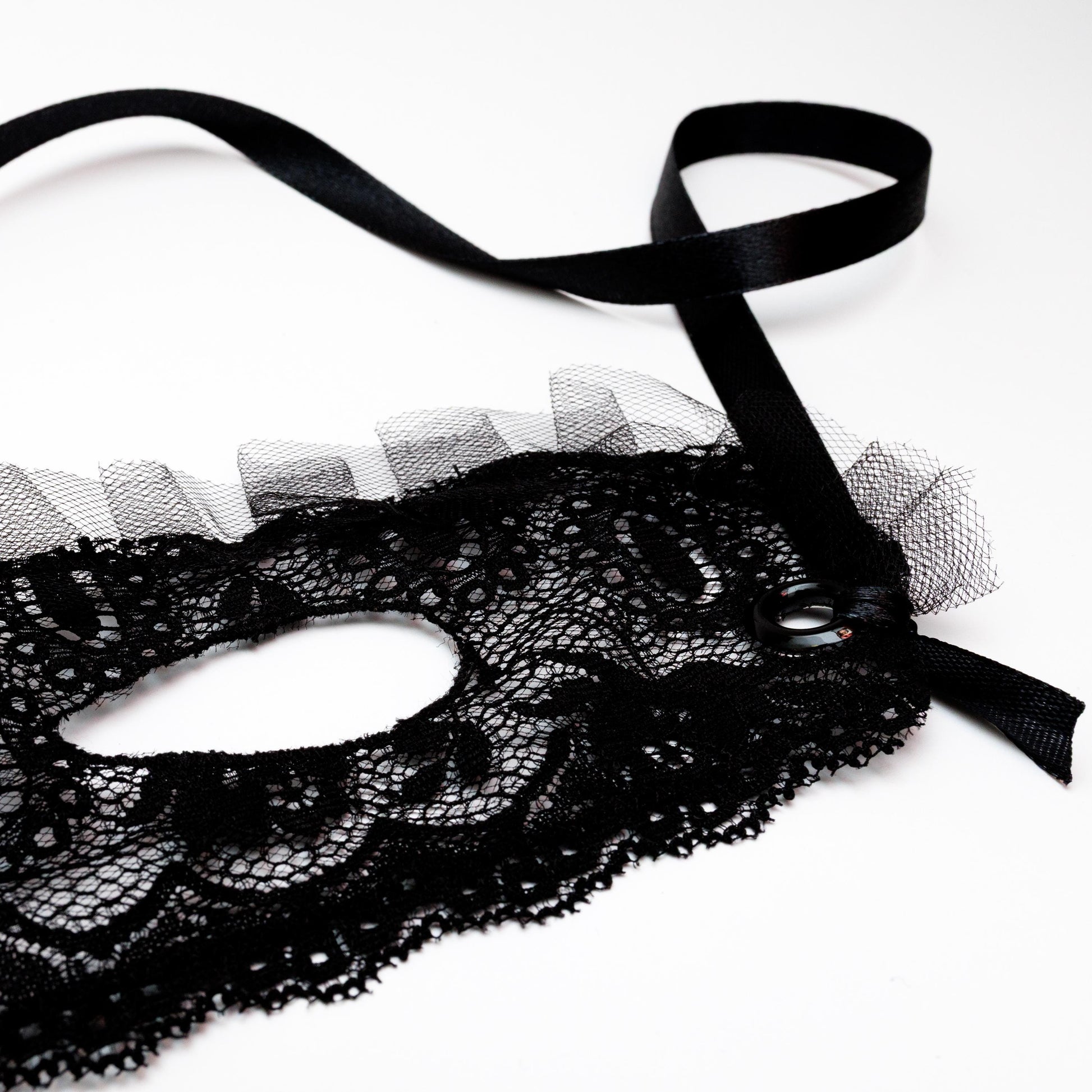 Crafted from delicate lace and finished with a soft layer underneath for comfort, this mask beautifully combines romance and edge. The fine tulle ruffle adds a graceful, flirty touch, while the black eyelets reinforce the satin ribbons for a secure and comfortable fit.