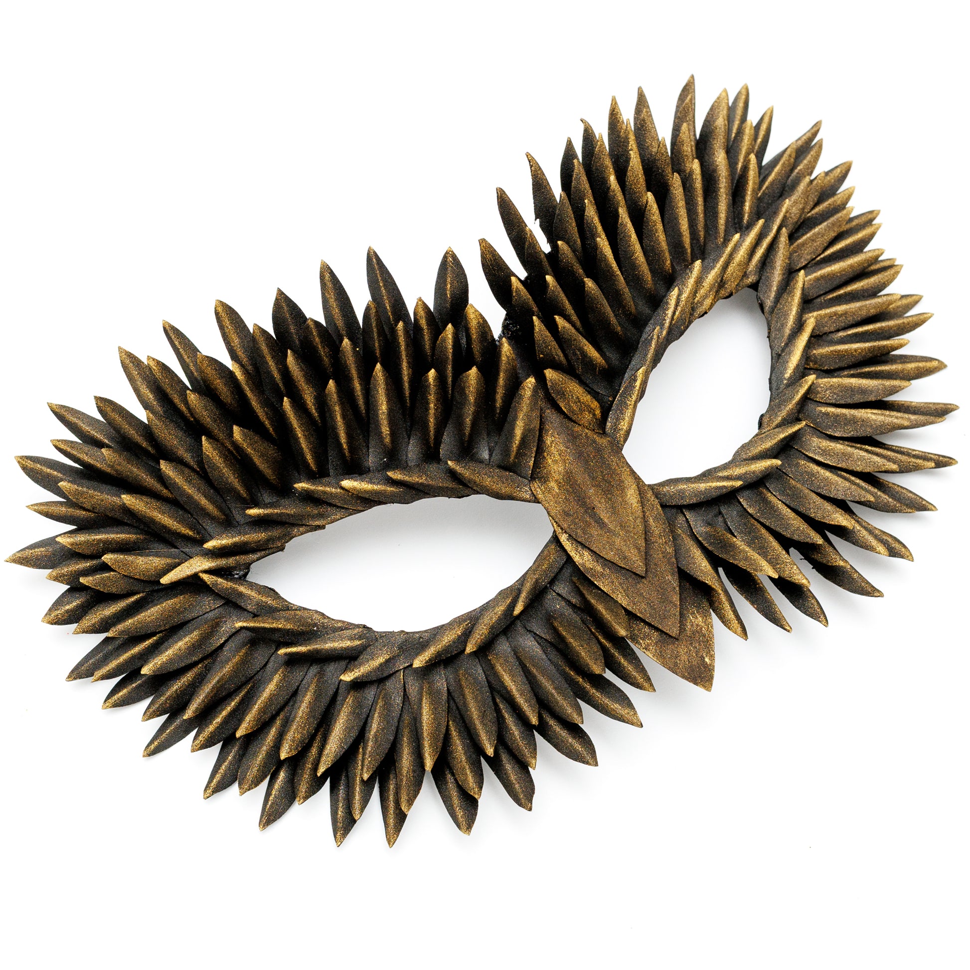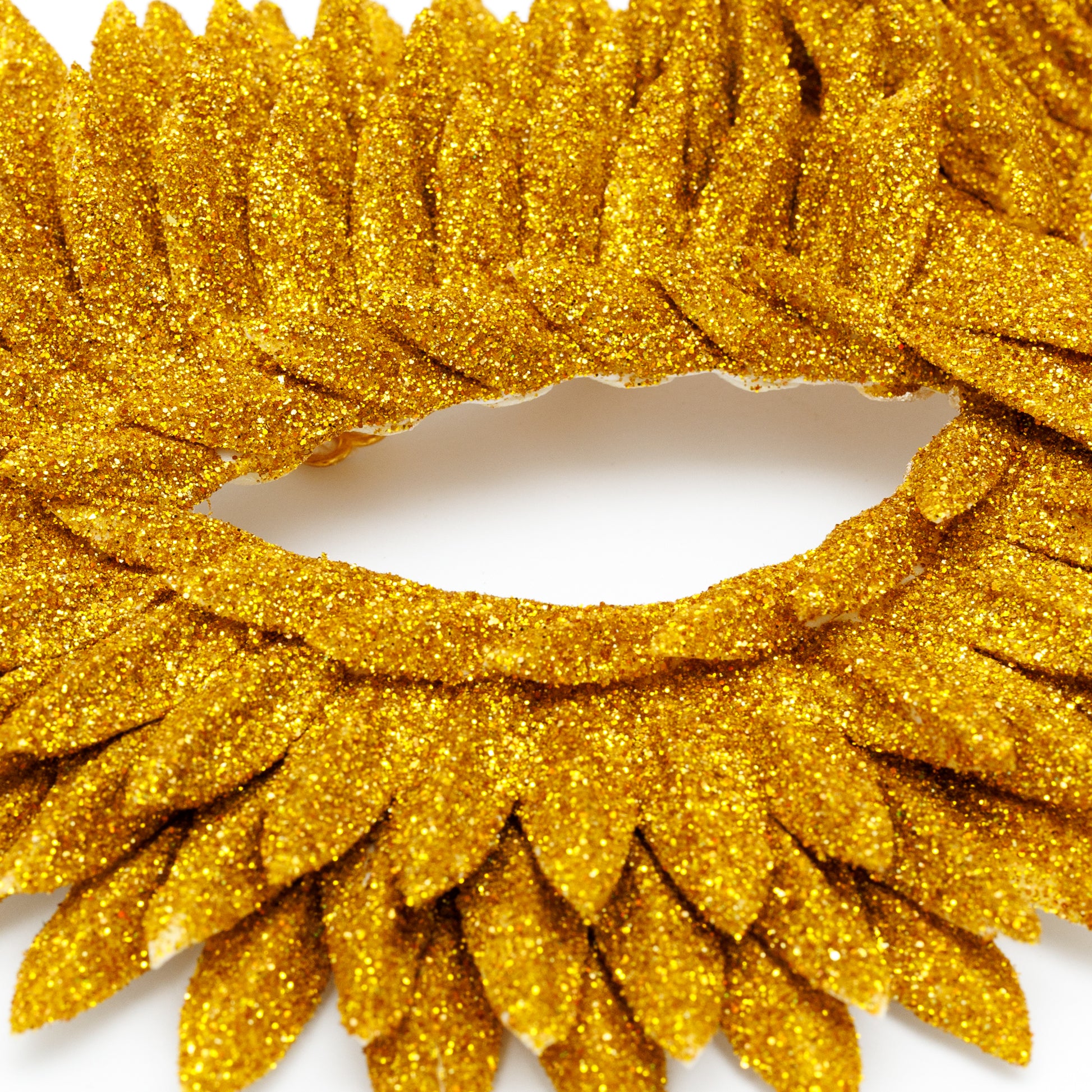 Shine at your next masquerade with this stunning gold glitter masquerade mask, handcrafted with layered feather-like details for a bold and elegant look. The shimmering golden finish catches the light beautifully, making it the perfect statement piece for a masquerade ball, carnival, Mardi Gras, Halloween party, cosplay, or theatrical performance.